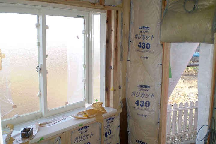 | 古い浴槽を取り外し、新しい浴槽を置く基礎も新たに作ります。 | 壁には新しい断熱材を設置し窓も新しいものを取り付けました。 |