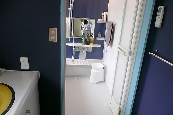 | 新しい浴室の入り口部分。フローリングもきれいに直しました。 | 見てください!このきれいなお風呂。大きな鏡と白い床がとてもきれいです。 | 窓から差込む日差しが、お風呂のひとときを優しく包んでくれそうです。 |