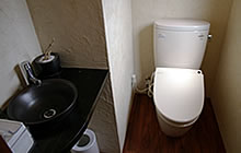 | シャンプーしているお客様が飽きの来ない様、モニターを設置しました。 | (右)トイレまでのアプローチ部分。壁にはオーナーの趣味であるサーフィンの写真が飾ってありました。(左)お手洗い部分は丸い鏡と手洗いの陶器がとてもマッチしています。 | 弊社で施工したトイレまわりです。白い壁とフローリングがとても合います。 | ||||
