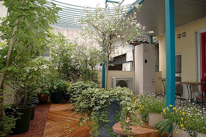 | エコキュートを2階のエントランス部分に設置しました。 | エントランスにはきれいな中庭がありました。 | とてもくつろげる空間になっています。 |